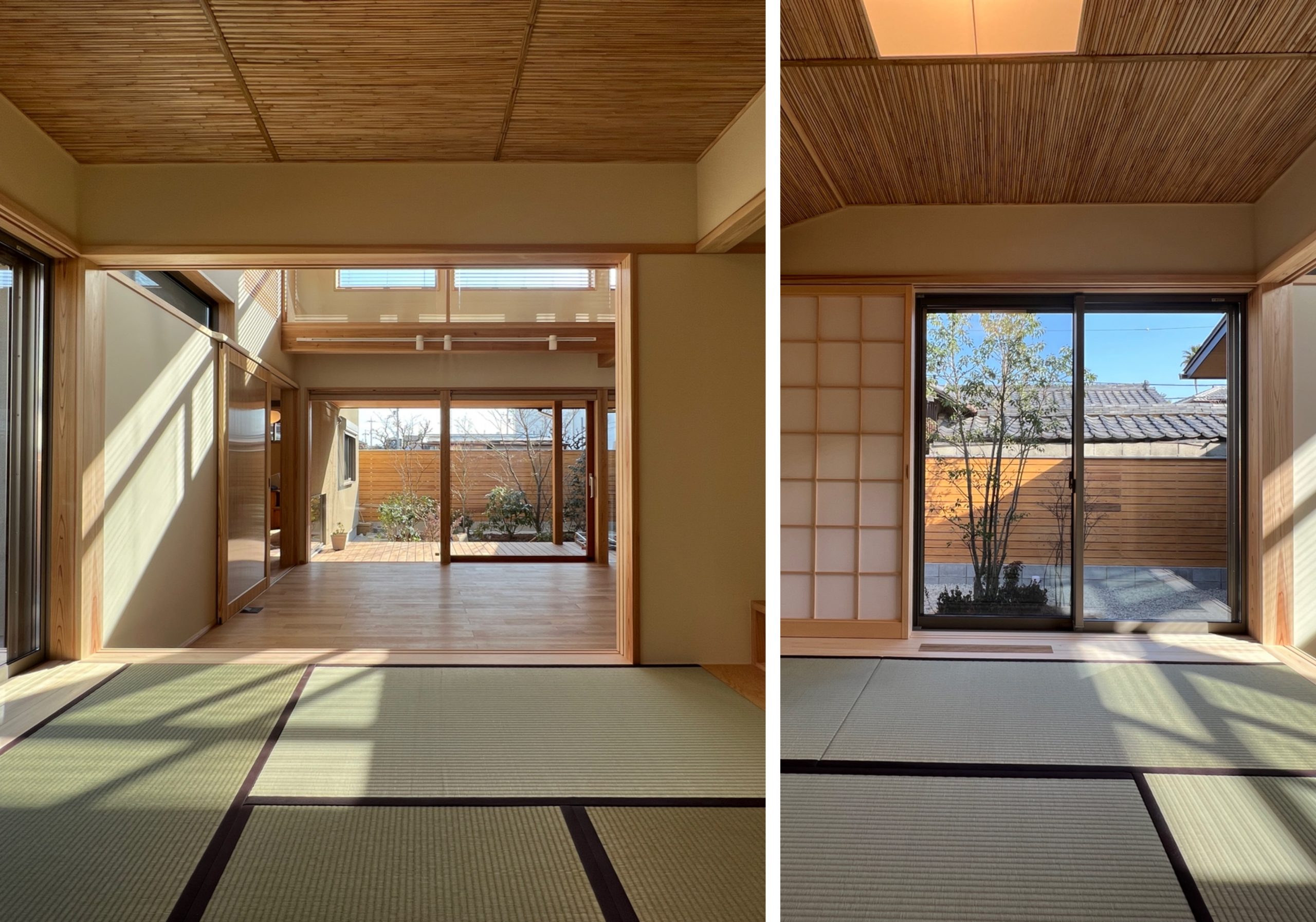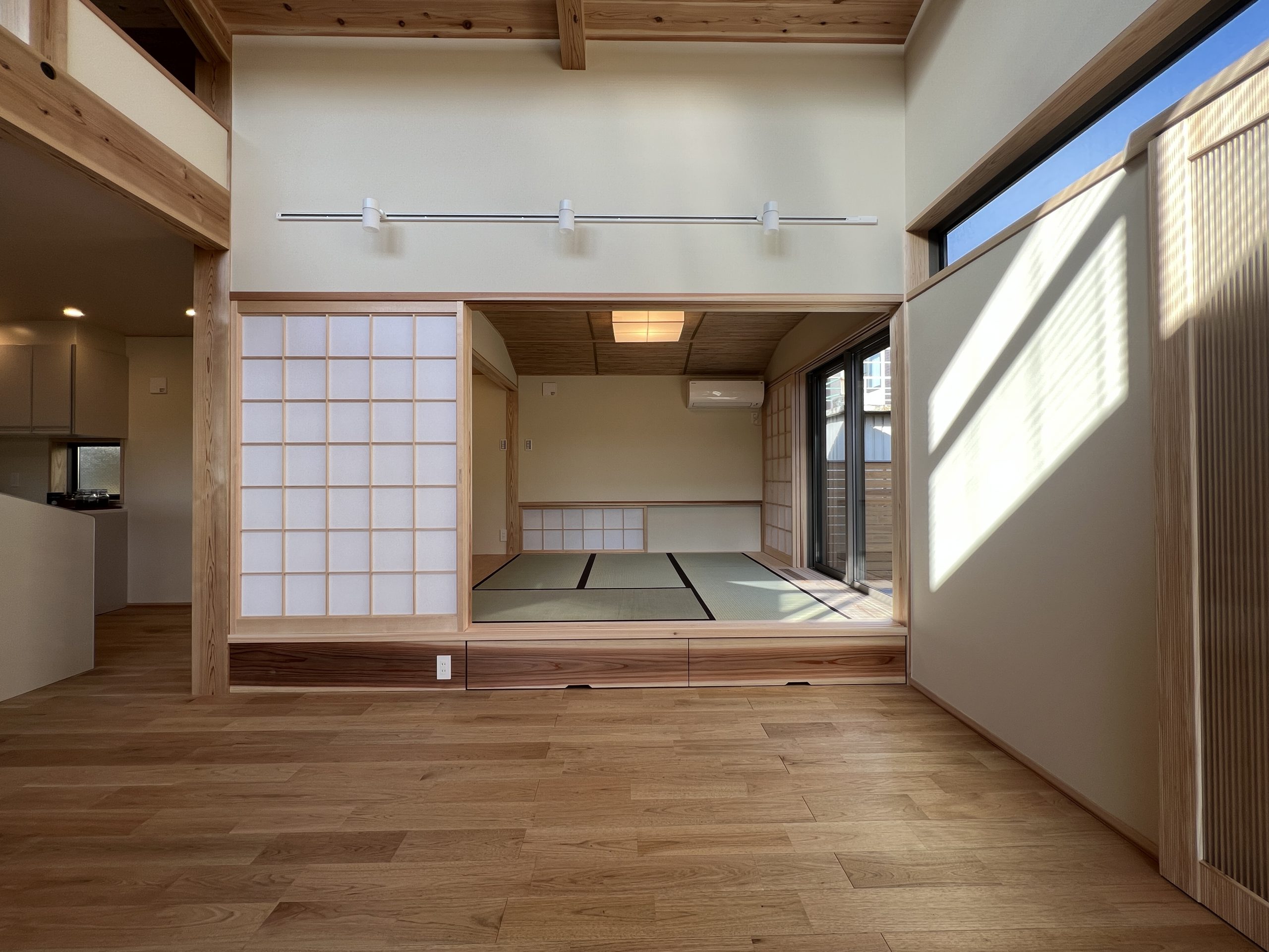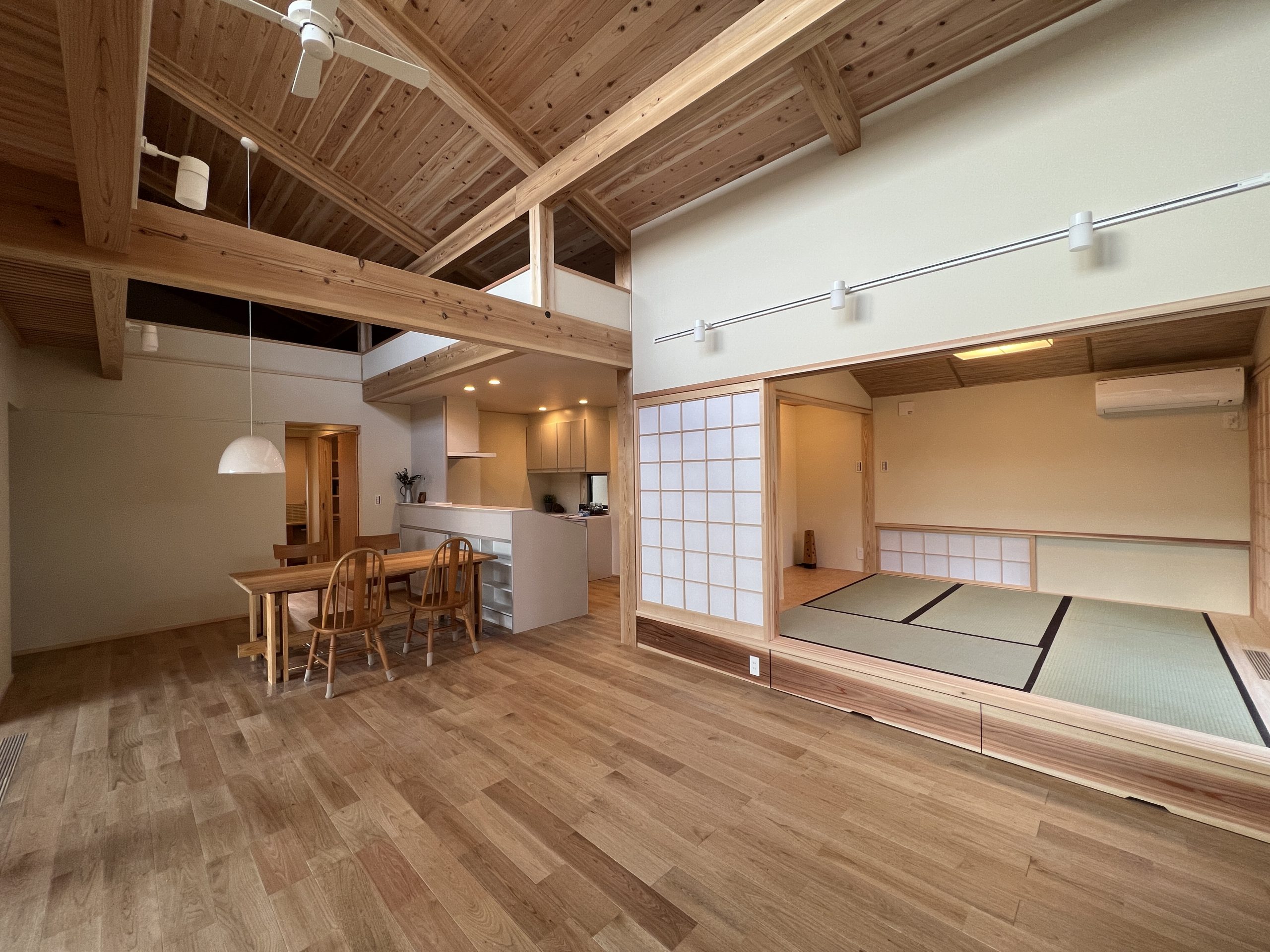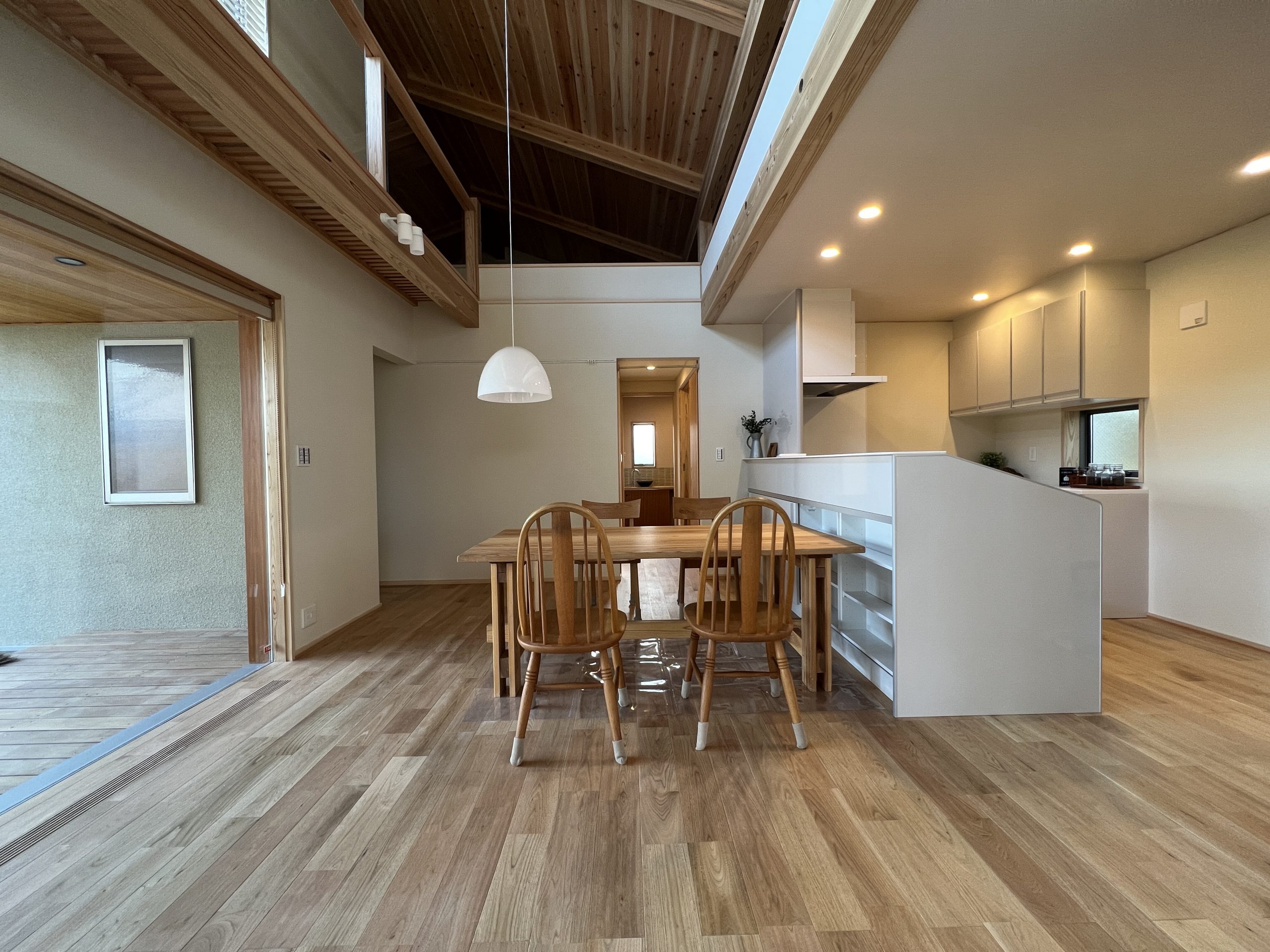 北庭や南のお庭を望めるリビングは吹抜けのある広がり空間に。日々の暮らしを豊かに過ごす平屋のお住まいです。