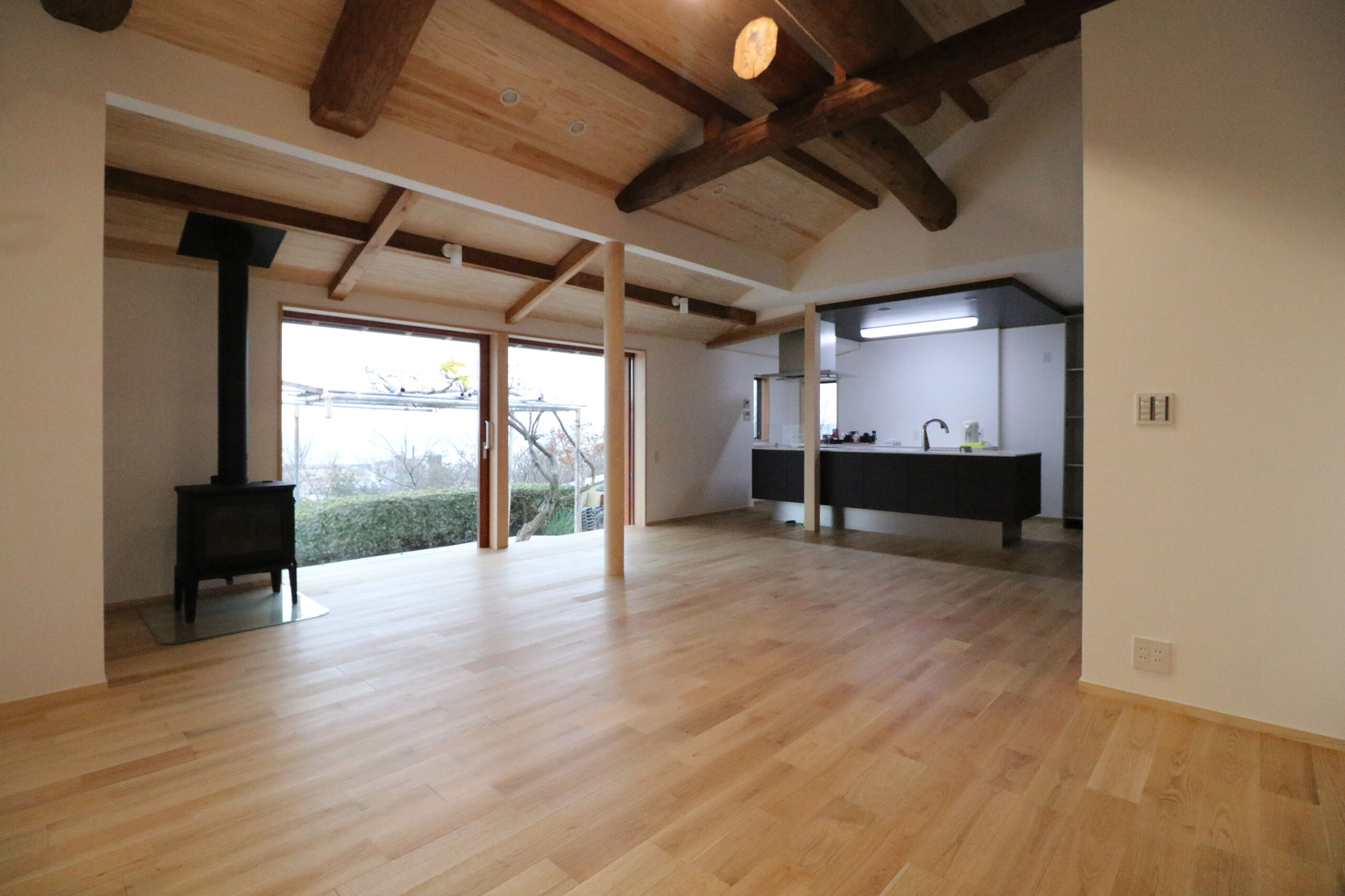 立地を活かした海を臨む大開口の窓、もともとあった立派な梁はそのまま残し、歴史を感じられる造りに。