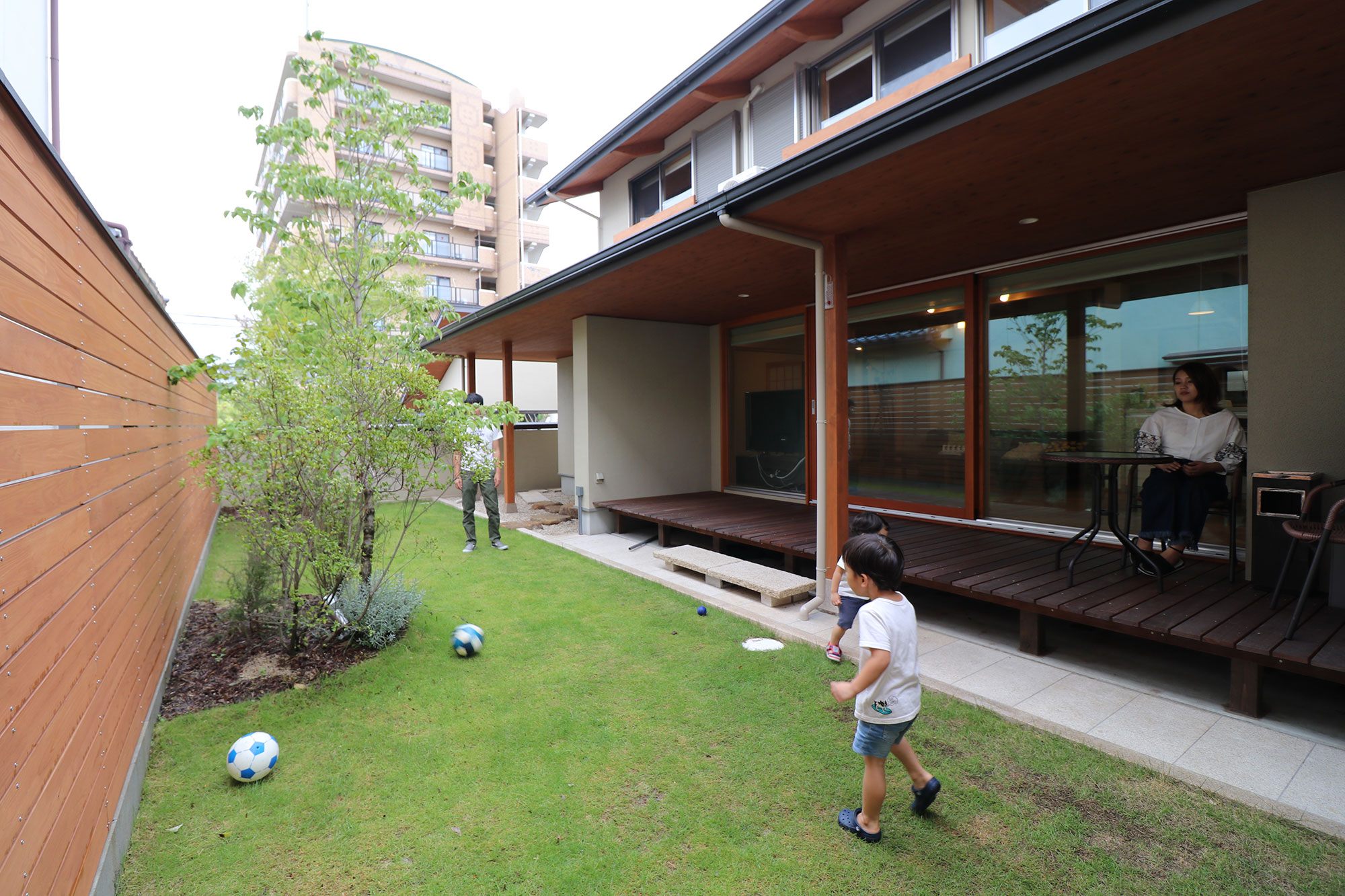 アプローチを利用して区切られたお庭では安全に子供たちが走り回れる空間になりました。家族それぞれが楽しく暮らせるそんなお家です。