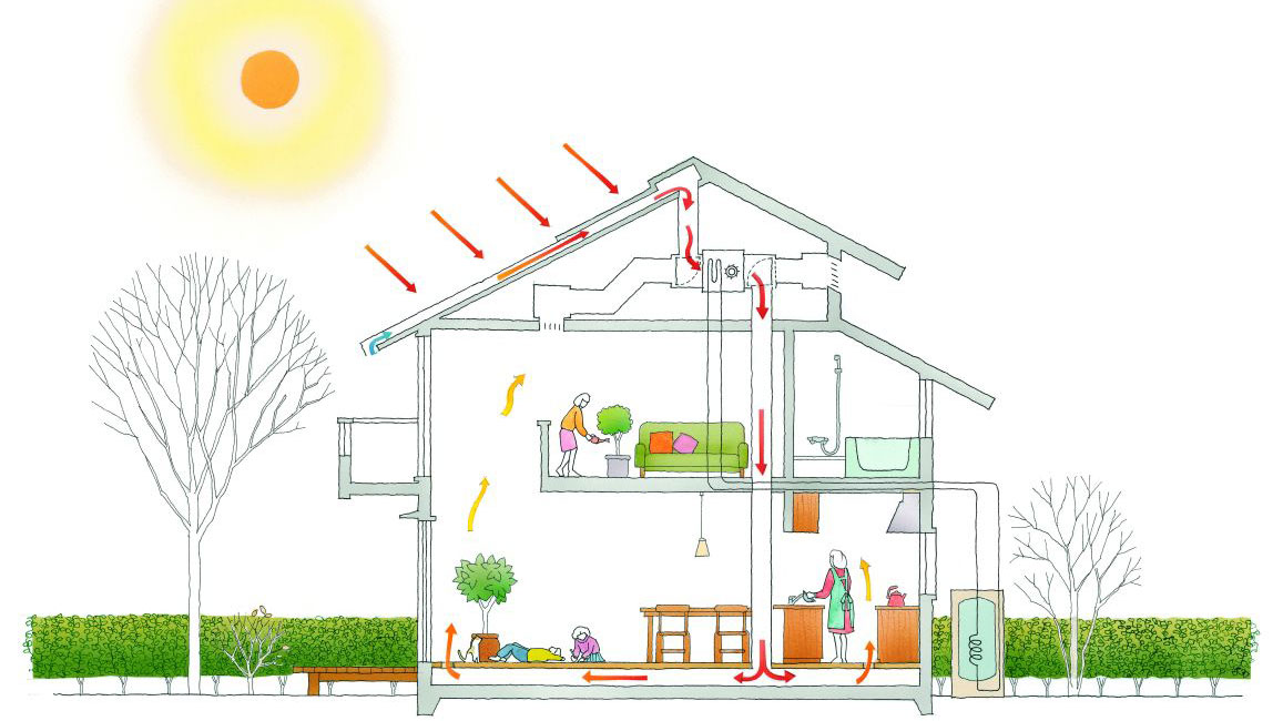 OMソーラーは、屋根で集めた太陽の熱を床下に送り込み、家全体を足元から温めるシステムです。