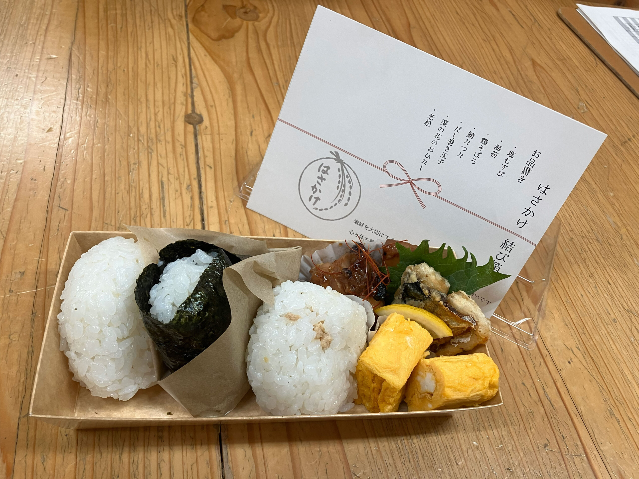 今回は、コアー建築工房の1階で営業している「おむすび処 はさかけ」がこの日のために用意した特別メニュー“はさかけ結び箱”をみんなでいただきました。