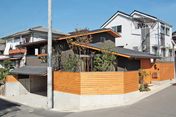 敷地の高低差を利用した掘り込みガレージ。