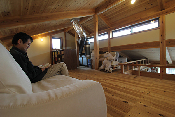 出来上がった家はロフトのスペースがかなり大きくとられているので、休みの日に本を読んだり、仕事をしたり、ソファがあるので座って本を読んだりPC をつかったりと落ち着いて作業できる空間になっています。