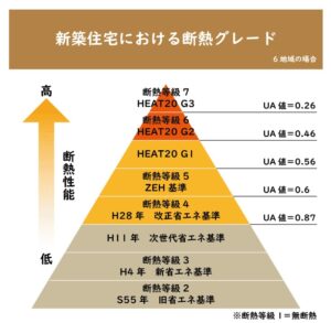 新築住宅における断熱性能にはグレードがあります。コアー建築工房ではUA値は0.56 HEAT20(G1)を標準としています。